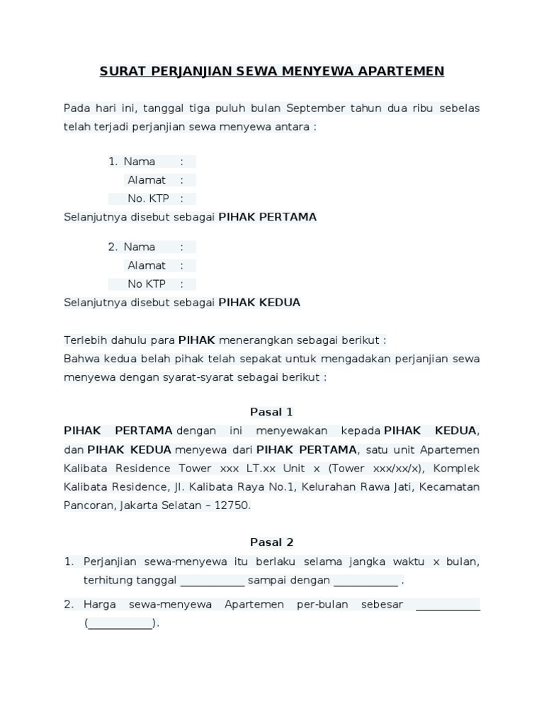 Contoh Surat Perjanjian Sewa Apartemen Yang Benar Jangan