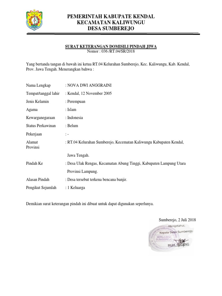 Contoh Surat Keterangan Pindah Tempat Tinggal